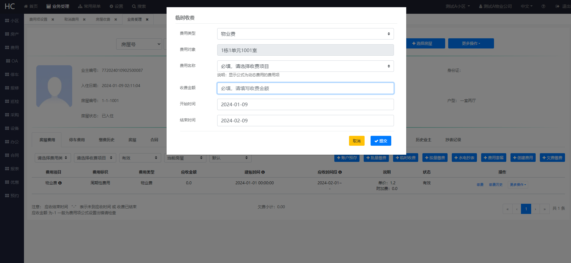 创建收费 缴费流程 退费流程 水电抄表 欠费催缴 打印收据 取消费用 缴费审核 缴费送积分 押金转存物业费 缴物业费送一个月 缴物业费打折