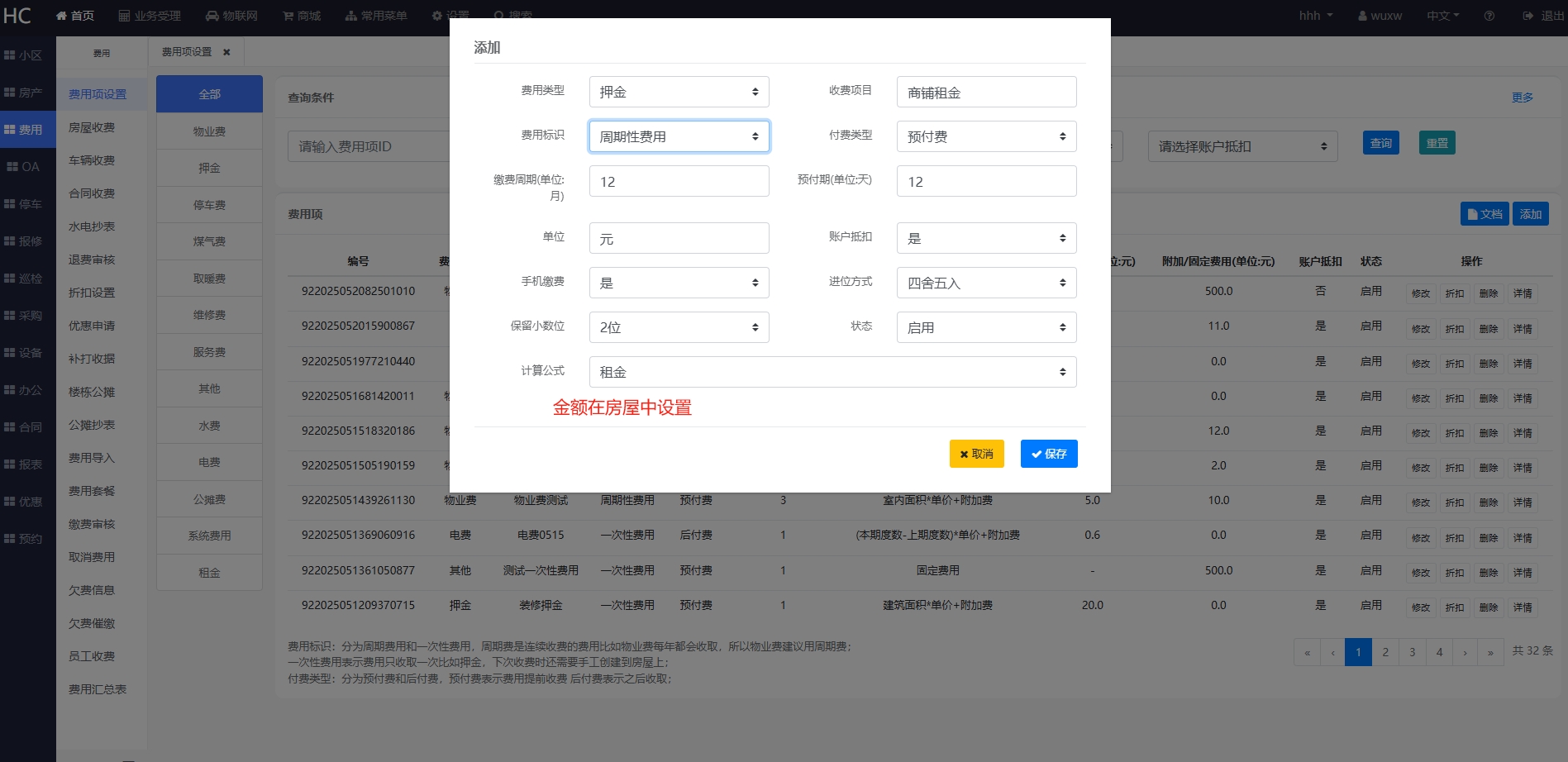 创建收费 缴费流程 退费流程 水电抄表 欠费催缴 打印收据 取消费用 缴费审核 缴费送积分 押金转存物业费 缴物业费送一个月 缴物业费打折